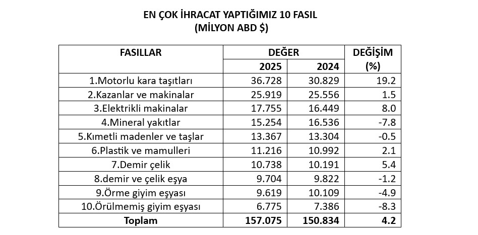 En çok ihracat yaptığımız 10 kalem ihracatımız içinde yerini ve istikrarını koruyor. Bu 10 kalem geçen yıllarda da aynıydı, birkaç küçük sıra değişimi dışında. 2024 de ihracatımızın %57.7’sini oluşturan bu maddelerin ihracatı bu yıl da %57.6 ile hemen hemen aynıdır. Sevindirici olan dünyada otomotiv sektörünün güçlük yaşadığı bir dönemde motorlu taşıtlar ihracatımızın bu 10 fasıl içerisinde en yüksek artışı göstermiş olmasıdır. Üzücü olan ise tekstil ve hazır giyim sektörümüzdeki erimenin artık bu tabloda da belirgin bir hale geldiğidir.
