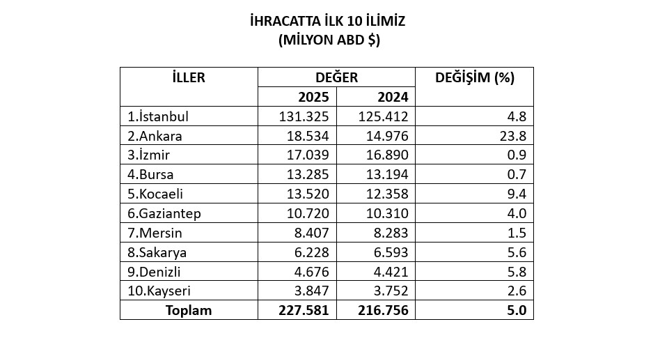2024’de toplam ihracatımızın %82.8’ini gerçekleştiren bu 10 ilimizin genel ihracatımız içindeki payı 2025 yılında 83.3’e yükselmiş, bu listede yer alan 4 Marmara Bölgesi ilimiz (İstanbul, Bursa, Kocaeli, Sakarya) ihracatımızın %60.1’ini, İstanbul ise tek başına %48.1’ini yapmaktadır. 81 ili bulunan ülkemizde bölgeler arasındaki ekonomik uçurumu gösteren önemli bir göstergedir bu durum.